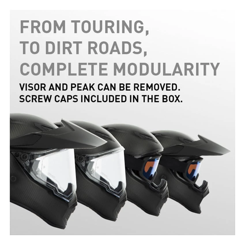 The AGV AX9 Mono helmet has superior modularity allows 4 different configurations, simply removing the redesigned peak and the ultra-panoramic visor. The lightweight construction of the Carbon+Aramid+Glass fiber shell provides AGV highest safety standards, while premium interiors are water-resistant and extremely comfortable. Aerodynamics and ventilation reach a new standard thanks to new extractors and the new adjustable chin guard port that can direct internal airflows where the rider needs.