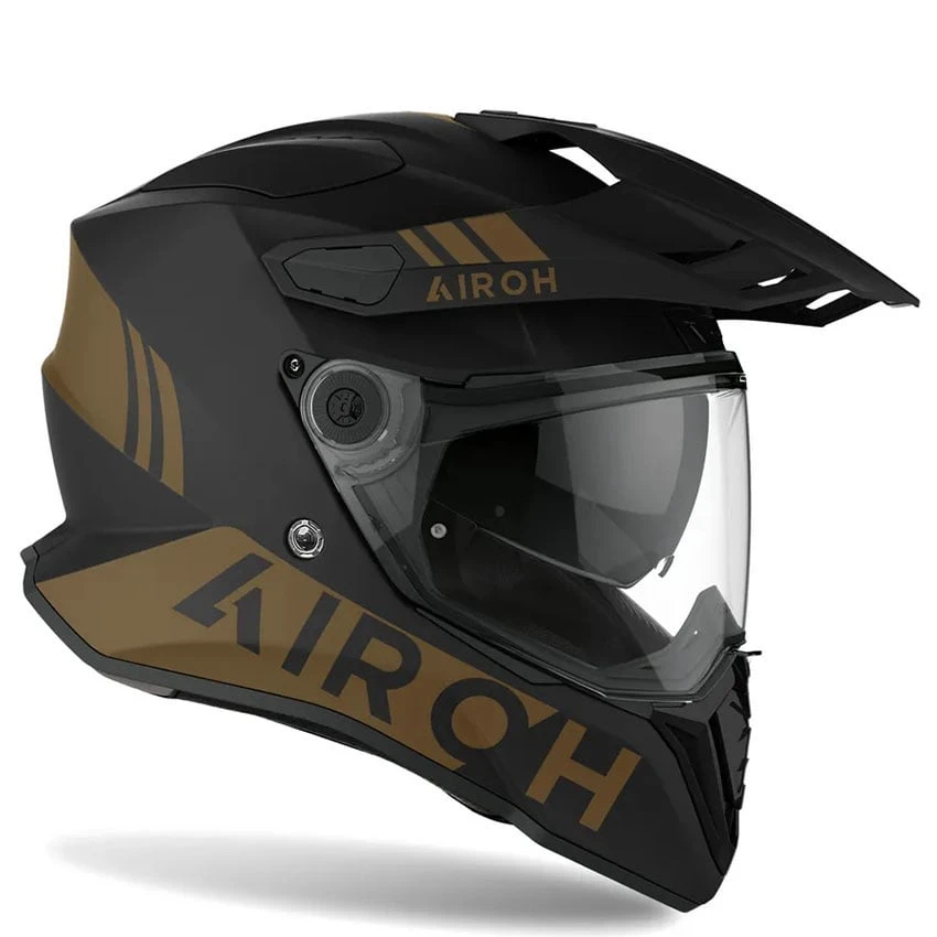 The Airoh Commander Gold adventure/dual purpose motorcycle helmet will adapt to any scenario. Its innovative design lets you easily change its nature. The peak is removable and so is the visor, allowing for 3 different configurations.