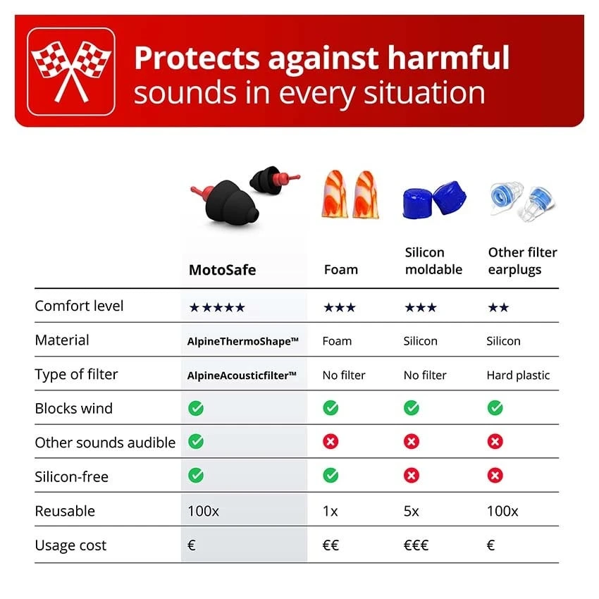 With the Alpine MotoSafe Race MotoGP earplugs you prevent hearing damage and are a lot less tired from the noise of wind noise. At an average speed of 120 km/h, your ears are exposed to 98 decibels of sound. This noise level means that after 7 minutes you already run the risk of permanent hearing damage, that you tire more quickly and that concentrating takes more energy.
