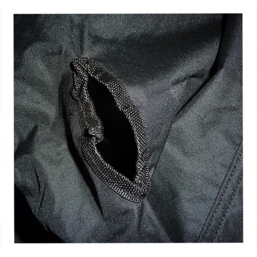 At the bottom of the front and back of the cover are openings through which the cover can be secured to the motorcycle with, for example, a chain lock. This prevents theft of the protective cover.