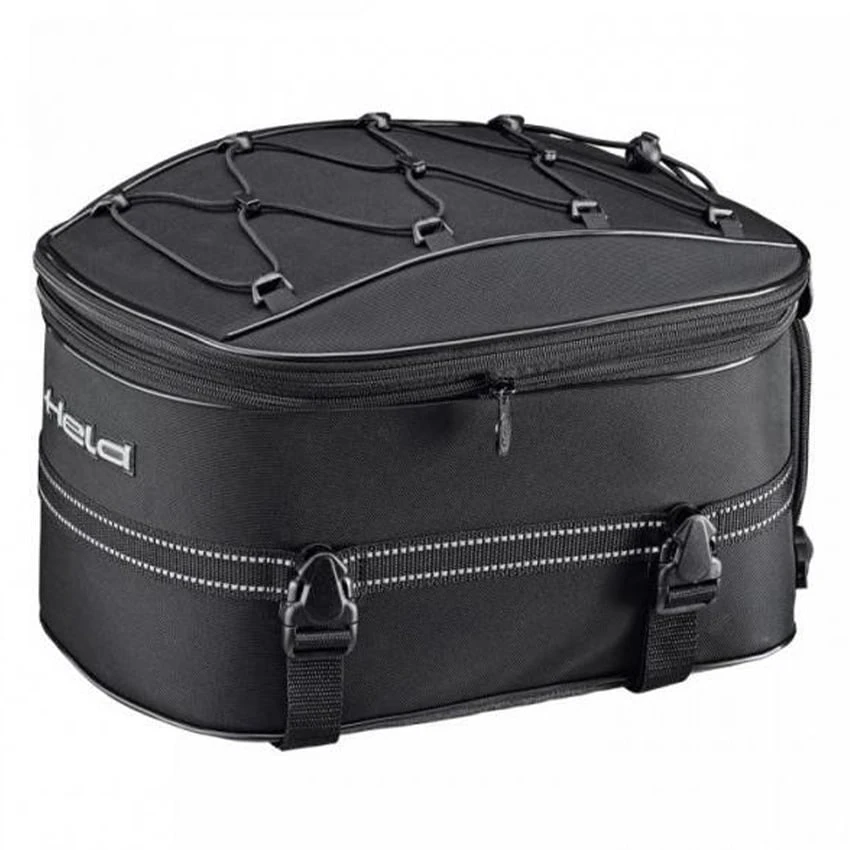 - Size L: a standard volume of 12 litres, good for a size of 36 cm x 28 cm x 18 cm. The height can be increased by a whopping 8 centimetres by means of a zipper, which immediately provides a storage space of 21 litres. An integrated helmet system disappears without any problems.