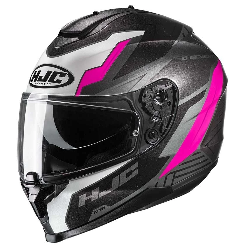 Get your money’s worth with the HJC C70 Silon pink motorcycle helmet. This helmet is equipped with integrated sun visor easy to operate with the easy-slide mechanism. The clear visor is prepared for the placement of an anti-fog Pinlock lens. Thanks to the wide visor you have an optimal field of vision. The Advanced Polycarbonate Composite helmet shell of the C70 Silon lady offers a lightweight full-face helmet with superior fit and comfort using advanced CAD technology. The “ACS” Advanced Channeling Ventilation system provides full front-to-back airflow to dissipate heat and humidity up and out.