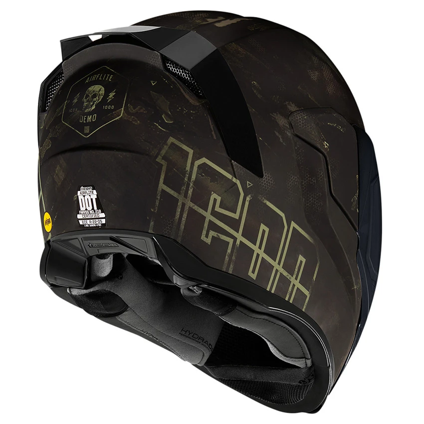 The exterior of the Airflite Mips Demo is Icons’ unique Rubatone finish with a mottled vision of earth-toned hues while the new Forceshield enables a clear line of sight. Inside, the Demo features the latest rotational-reduction system from MIPS. Ventilation system consists of strategically placed air vents, intakes, air channels and exhaust ports. The oversized chinbar intake enhances airflow, keeping you cool by routing air where you need it most. A decrease of both drag and weight was achieved by sculpting the traditional neckline of the Airflite to avoid jacket or suit interference.