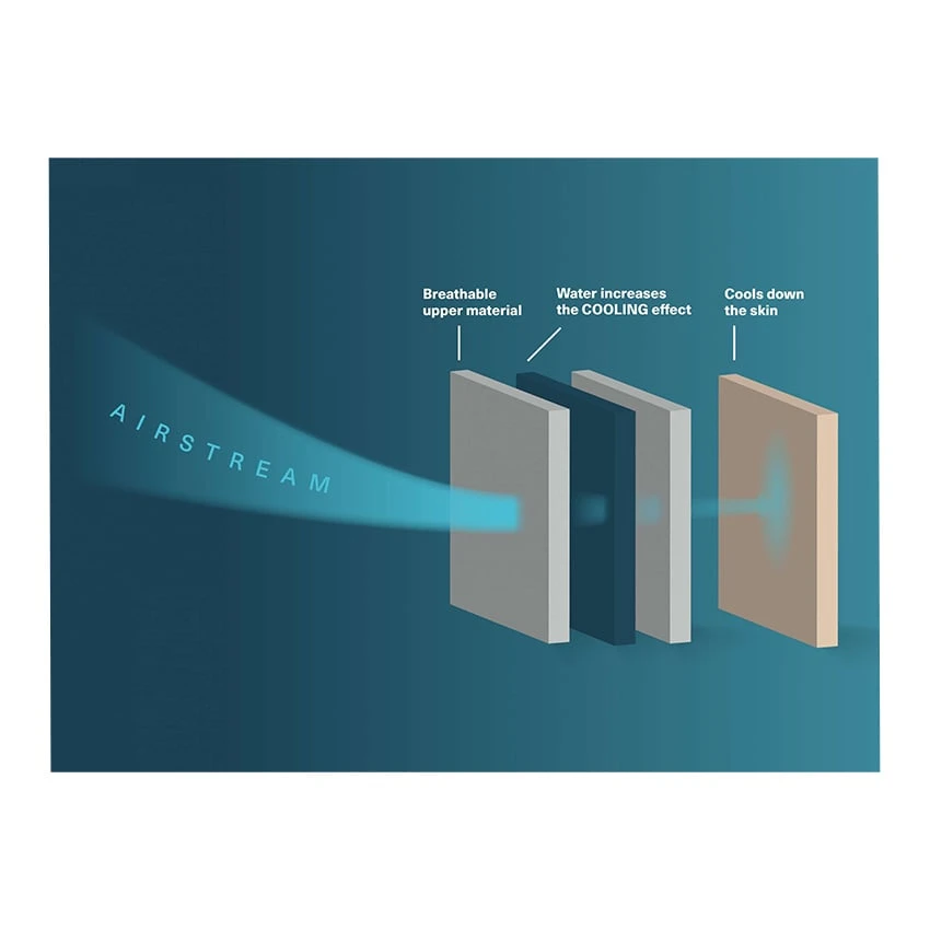 Simple to use! Immerse the Wristcool in water for up to two minutes. Squeeze out the excess water (but don’t wrinkle it). The cooling effect is produced by evaporative cooling and lasts up to eight hours, depending on the ambient temperature, humidity and airflow. This product works best in low to medium humidity environments. The height of the airflow determines the cooling effect.
