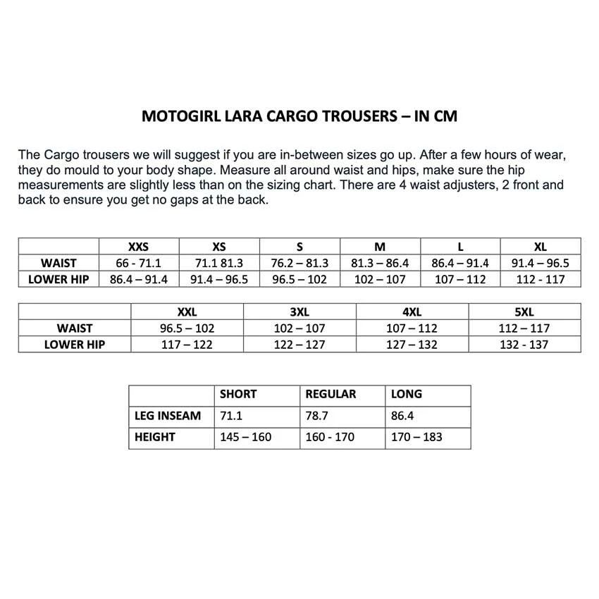 - *MotoGirl suggest if you are in-between sizes, go up. After a few hours of wear, the Lara Cargo do mould to your body shape.