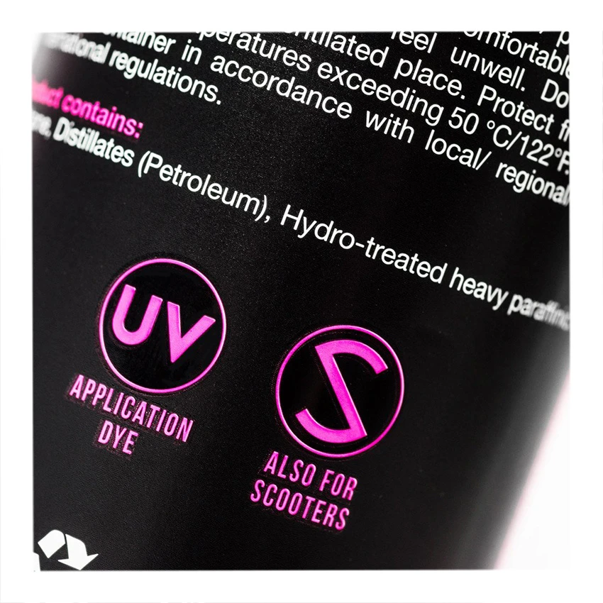 After years of research and development we identified that there were some big differences with what riders want and need from a chain lubricant. After all, Racing motorcycles, touring motorcycles and off road machines are all going to have different chain lube requirements. Muc-Off Ceramic Chain Lube is the first of its kind and is set to revolutionise chain efficiency and performance for all motorcycles covering longer distances and is ideal for tourers or commuters as you can go far longer between reapplication intervals. Our unique water repellent, ceramic, non-fling formula penetrates deep into the chain link. This creates a durable protective coating which will guard your chain against corrosion and metal to metal wear, in all weather conditions. An added benefit to our unique formula is that it includes a UV Dye, which means you can accurately see the lubricants specific coverage when using a UV Torch. This also allows you to wipe away any overspray that may have otherwise gone undetected.
