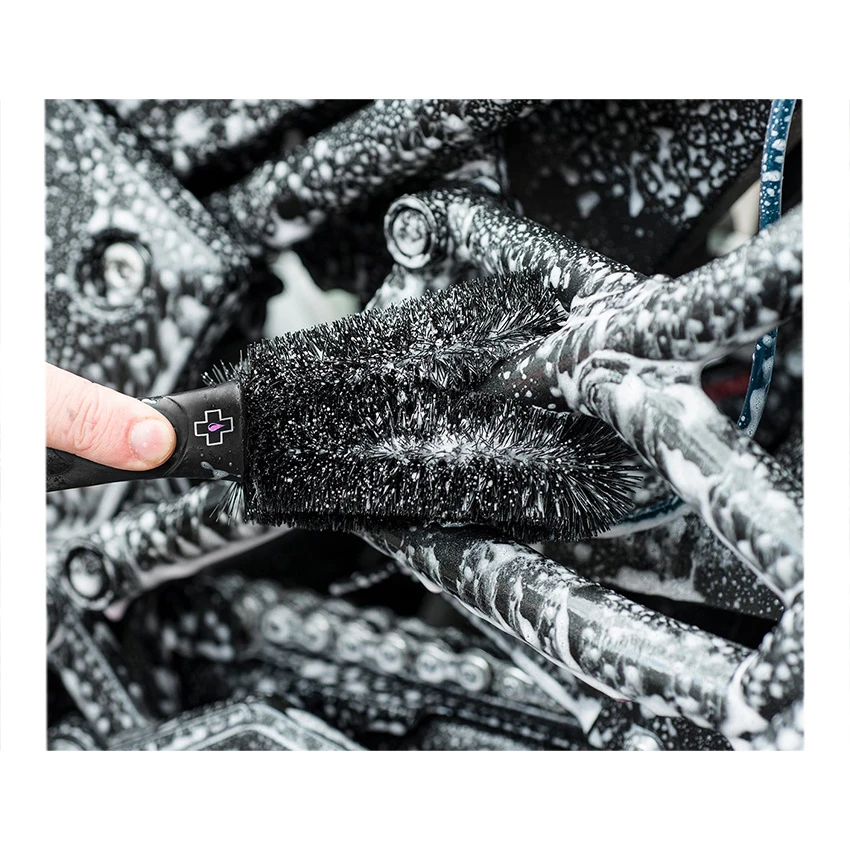 This Two Prong Brush is ideal for reaching hard-to-shift dirt on spokes, discs, shocks, cranks, linkages and pedals.