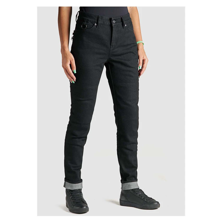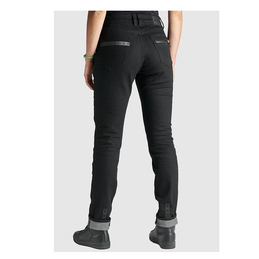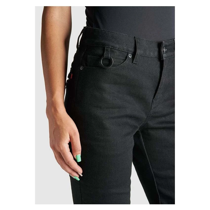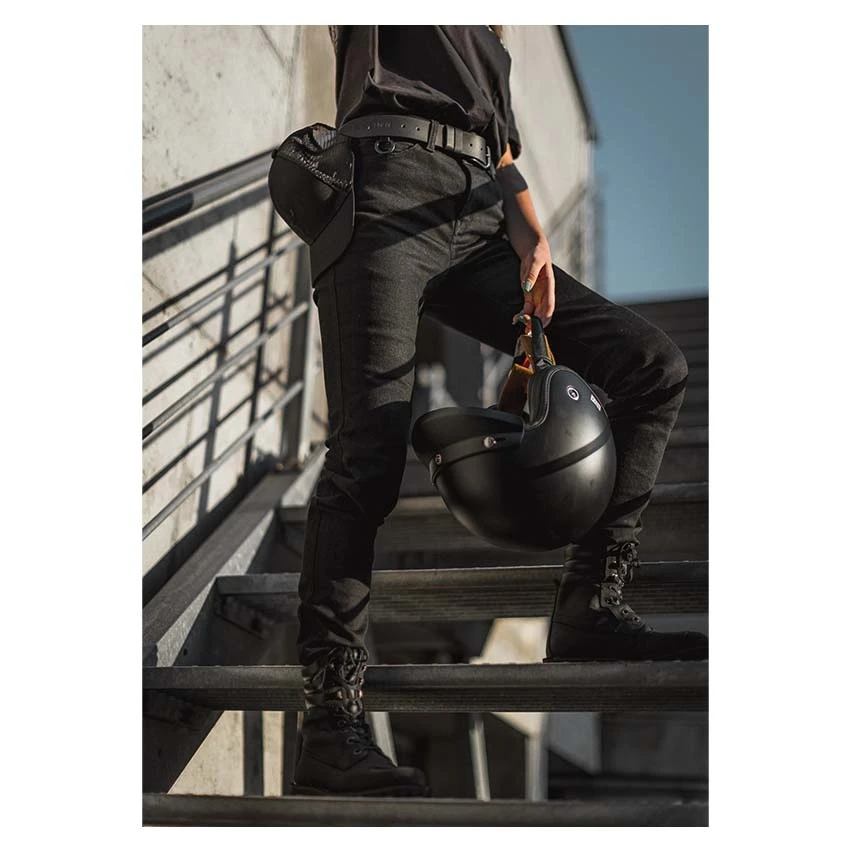 Single layer women’s motorcycle jeans made of 13oz super-stretch Armalith® material. An abrasion resistant and highly heat-conducting fabric. The Pando Moto Kissaki Arm is standard delivery with level 1 protectors on the knees and hips. This jeans has a slim fit and regular waist, with a reflective print on the cuffs for better visibility.