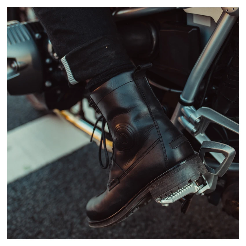 The Portland motorcycle shoes are high-quality leather boots with a sturdy appearance. They pair perfectly with your protective riding jeans and a leather jacket yet don’t take away from your fashionable looks when walking the streets. These shoes take you back to the future; combining styling from the past (archetype inspired “worker boots”) with tomorrow’s protection. Hand-stitched details and a small reflective piece at the heel show that traditional styling and modern details go hand-in-hand when creating your next favourite pair of shoes. And to make them ride-ready, we’ve included a leather shift pad when you’re taking on the urban jungle. Reinforced heel and toe cups and thermoformed cups on both sides of the ankle ensure protection is incorporated invisibly to offer protection that is up to the CE requirements. A true boot in appearance, the Portland are as tough as Urban motorcycle shoes get without becoming uncomfortable thanks to the OrthoLite® insole.