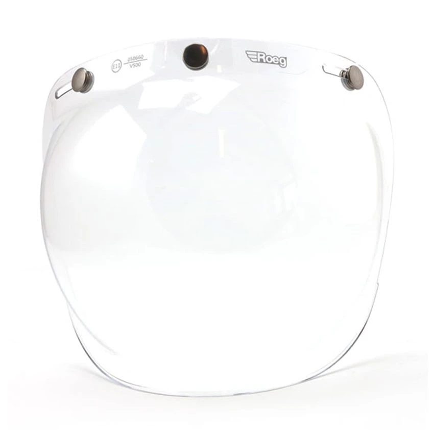 The ROEG® Bubble visor aesthetically vintage and optically precise, scratch- and impact-resistant solid polycarbonate with ECE 22.05 approval. The shields fit the Roeg Jett and Jettson helmets with the three snaps across the brow.
