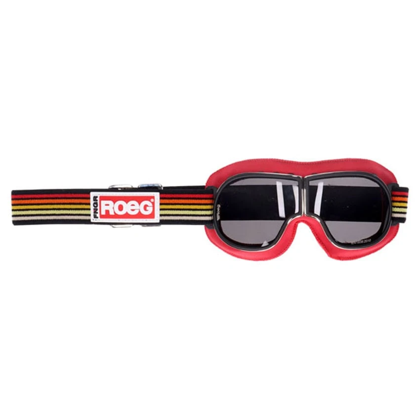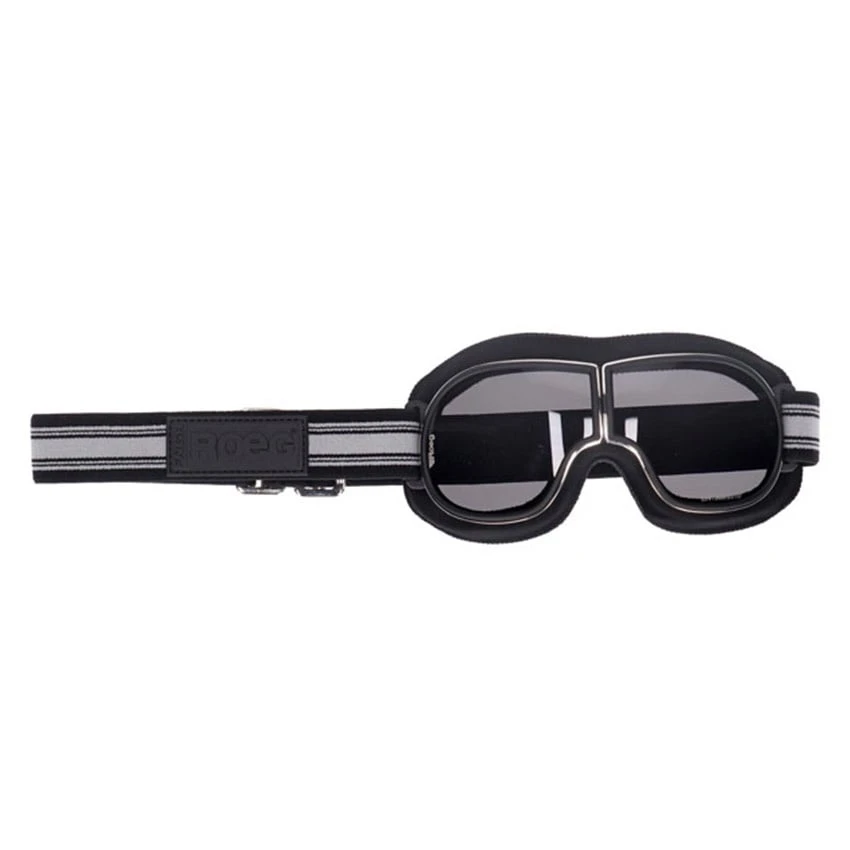 The ROEG® Jettson goggle meet the CE EN1938:2010 regulations suitable for motorcycle use. The chrome goggle frame is finished with 100% premium cowhide and fitted with a grey anti scratch lens and a 35mm woven striped strap.
