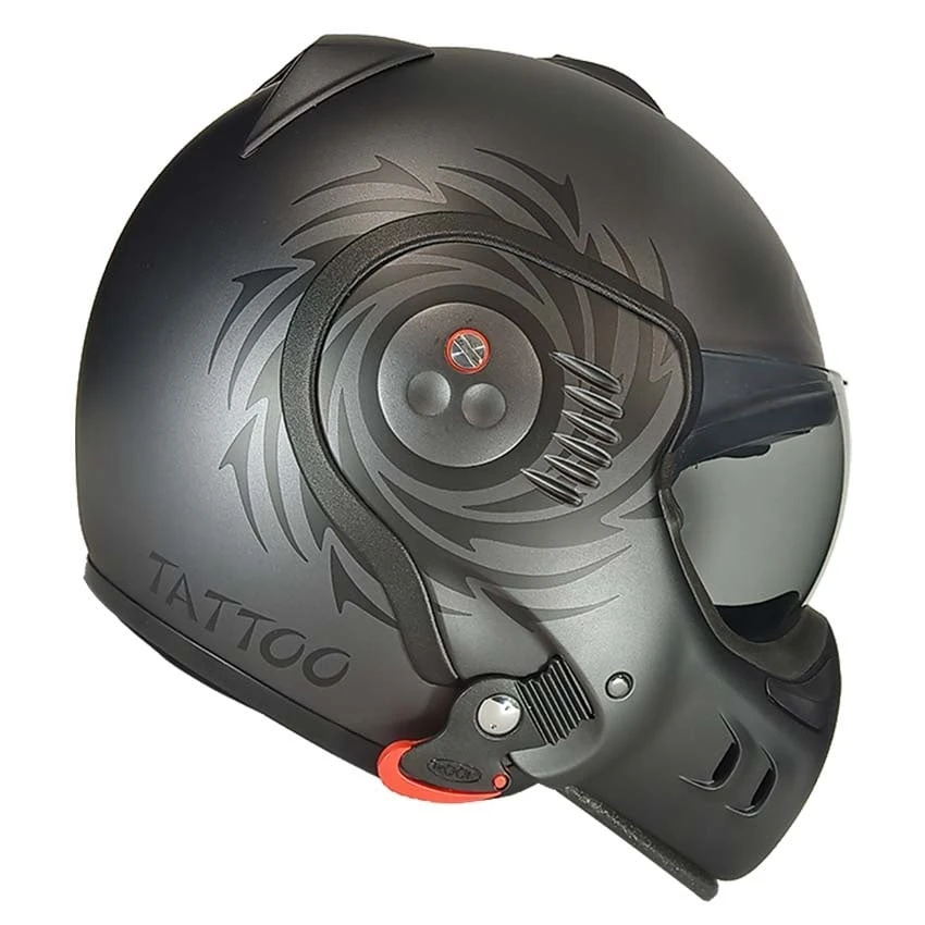 Roof RO5 Boxer V8 S Tattoo offers an optimised Boxer V8 version: new lip seal for an increased sealing, fully removable, washable and adjustable new Silent Lining comfort, new antibacterial and quick drying fabric and a new micrometric chinstrap buckle.