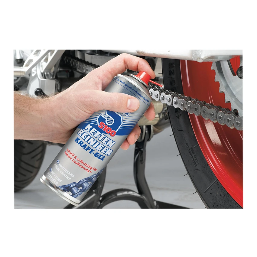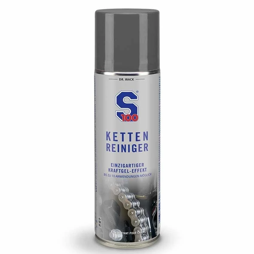 A treatment with S100 Chain Cleaner directly improves the running properties, less resistance and friction, reducing wear on chain and gears. Tested and released for O/X/Z-ring chains. Removes all dirt and grease from the chain quickly and effectively, even between the links. Ideal for removing chain flare from the rear wheel. Is absolutely safe for all materials, contains special additives for corrosion protection and is acid-free.
