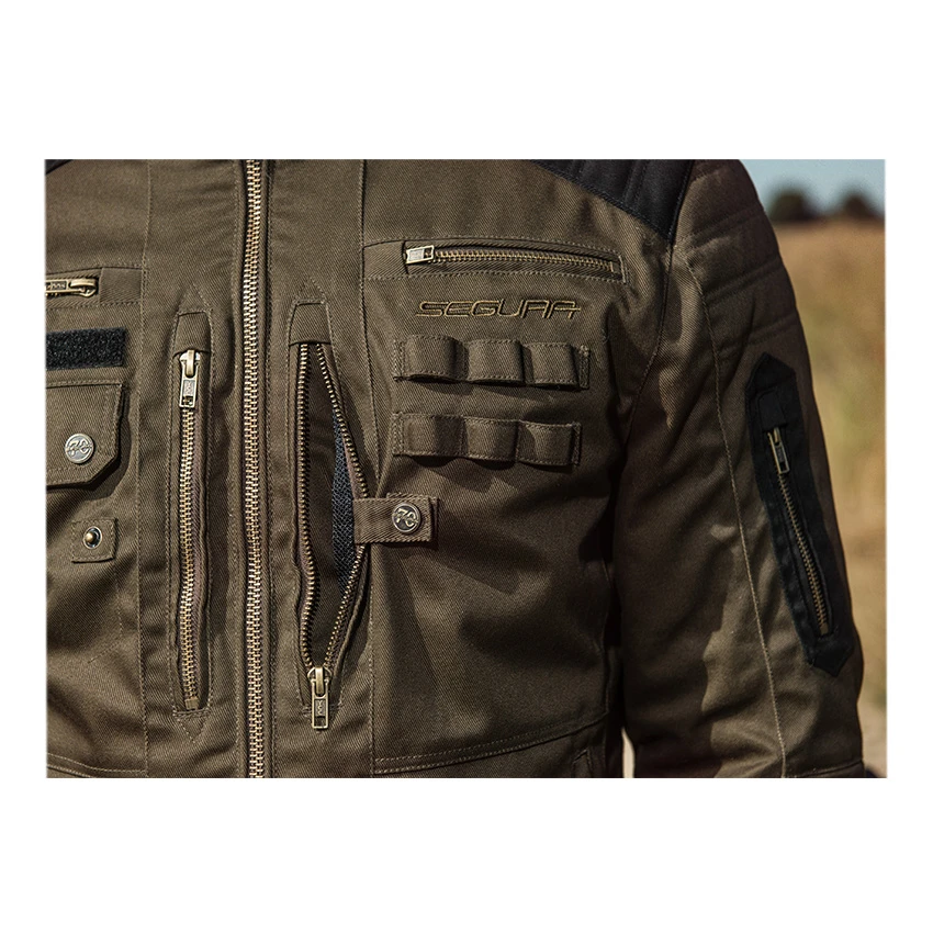 Waterproof textile motorcycle jacket from Segura, the Fergus has some traditional details that give this jacket a light retro-vintage-military-classic style. Made of robust Serica fabric combined with Segura’s waterproof membrane. The 90g thermal lining allows you to easily adapt this jacket to the current weather conditions. The Fergus motorcycle jacket comes standard with an Alpha level 1 protector on the shoulders and elbows, and if desired, you can insert a back protector into the designated pocket on the back.