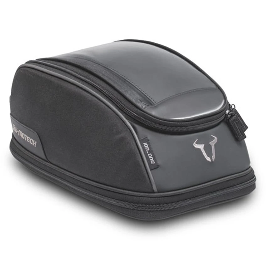 ION series tank bags. The new generation of ION tank bags captivates with its sleek design. Soft vinyl details, embroidered SW-MOTECH bull and reflective textile piping give these black tank bags an unmistakable look. Of course, the new ION tank bags have proven features such as volume expansion, integrated map holder, internal mesh compartments, and splash-proof cable feed-through and integrated carrying handle – all at an attractive price. One particularly handy feature for everyday driving is the practical mounting system: In seconds, the ION tank bag can be fixed to the ION tank ring and removed just as quickly via the QUICK-LOCK function.