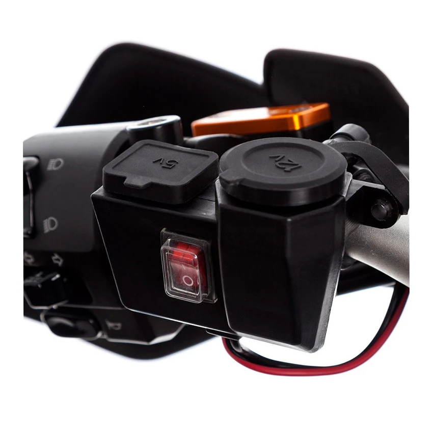 12V charger with 5V / 2 Amp double USB port and 12V cigarette lighter socket for the handlebar.